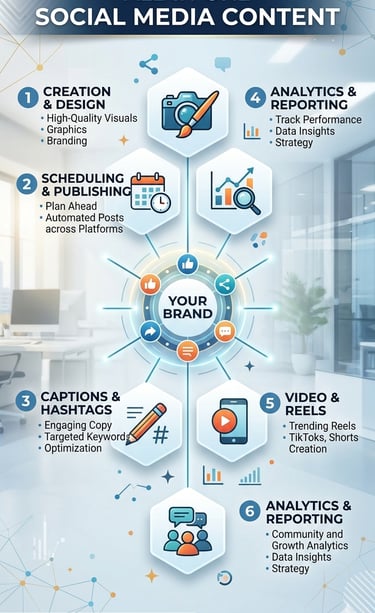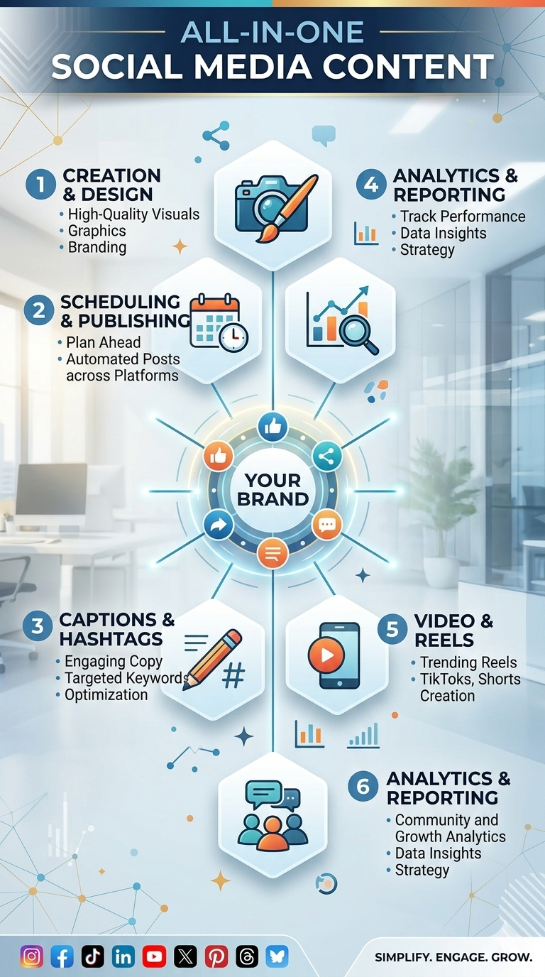 We don't just post; we create. From high-converting LinkedIn carousels and viral-ready X threads to fully produced faceless videos for TikTok and Reels, we build your entire social presence from scratch. Using advanced AI-driven research and custom brand kits, we turn your ideas into a high-performance content engine that runs 24/7.
